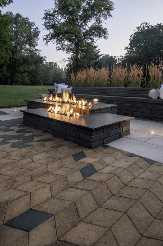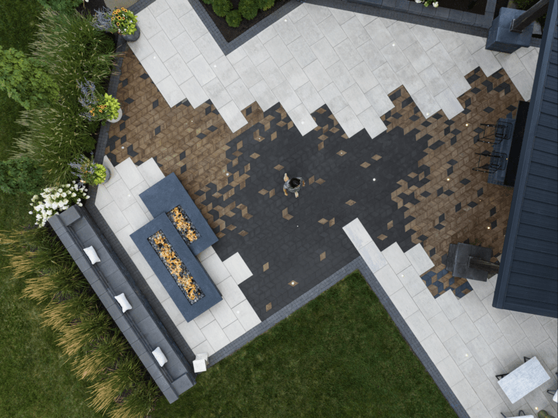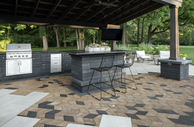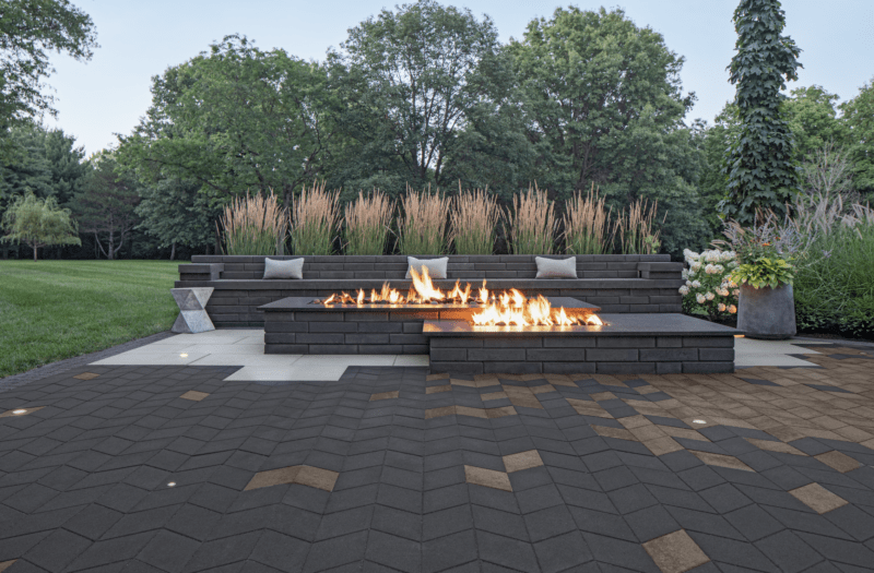 This backyard space is undeniably a masterpiece, designed to elevate outdoor living to new heights. Techo-Bloc’s Diamond HD² Smooth pavers in Onyx Black and Chestnut Brown create an elegant, durable foundation. Their smooth texture underfoot adds a touch of sophistication, making them the ideal choice for a patio that exudes both beauty and functionality.