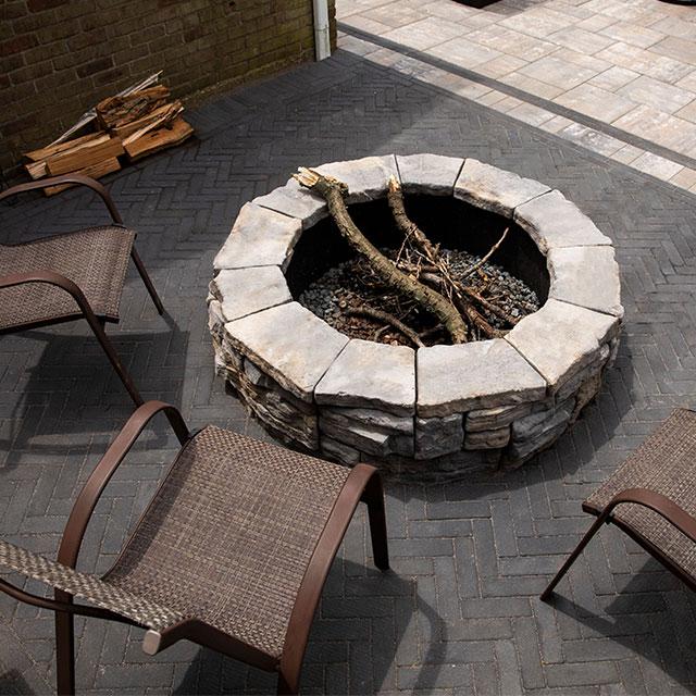 Available in your choice of York Brown, Mocha, or Bluestone, this fire pit boasts natural textures and colors that will blend beautifully with the entire collection of Nicolock’s attractive Rosetta Hardscapes. The standard kit comes complete with a Belvedere wall, metal insert, and coping. No cuts are required, making installation fast and waste-free. Gas options are available.