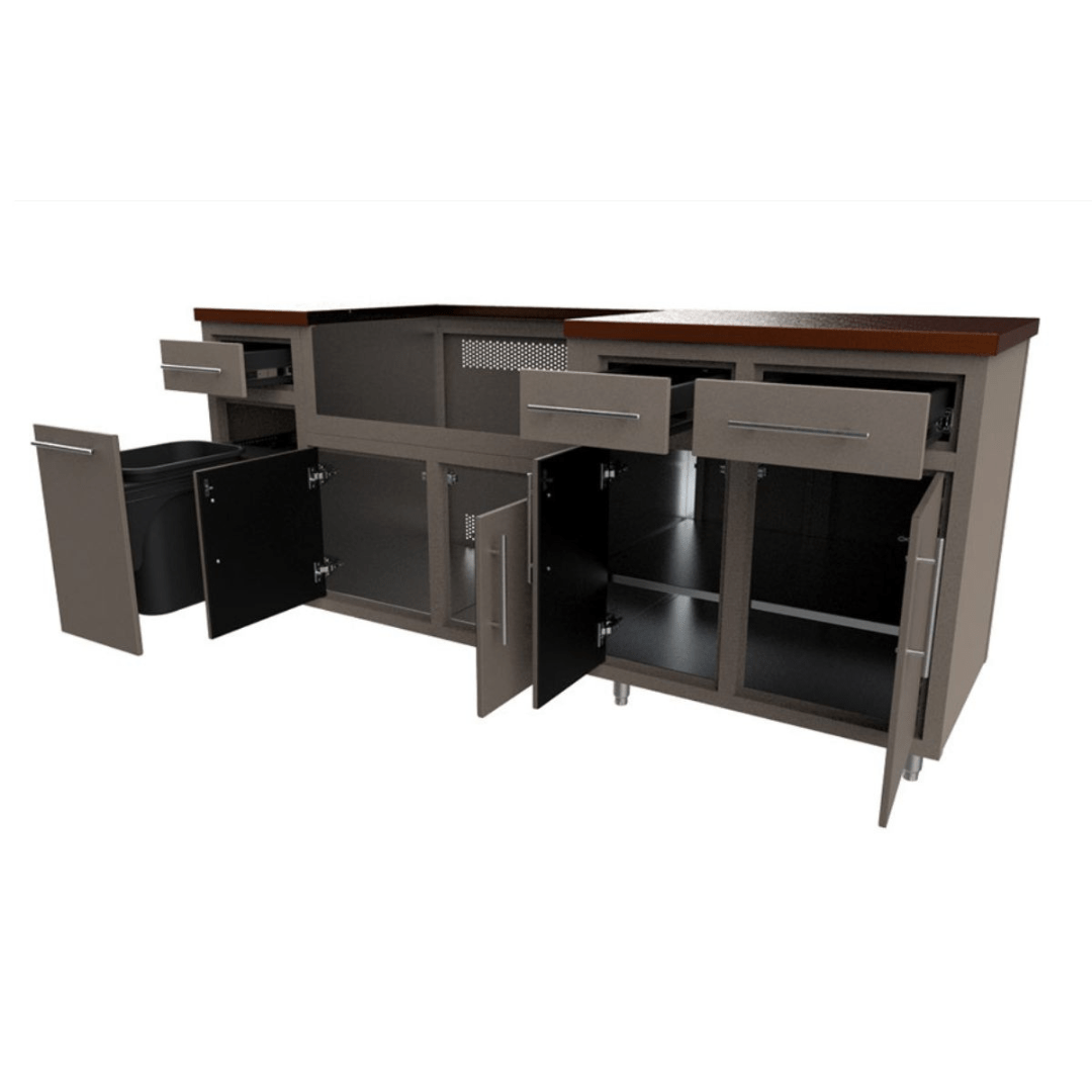• From left — waste bin with drawer above, gas grill base, door drawer with adjustable shelf x 2
