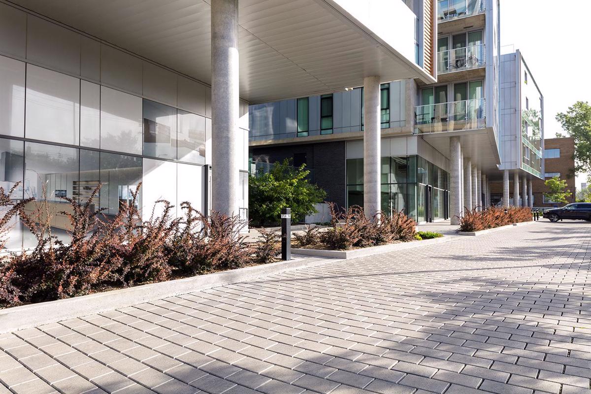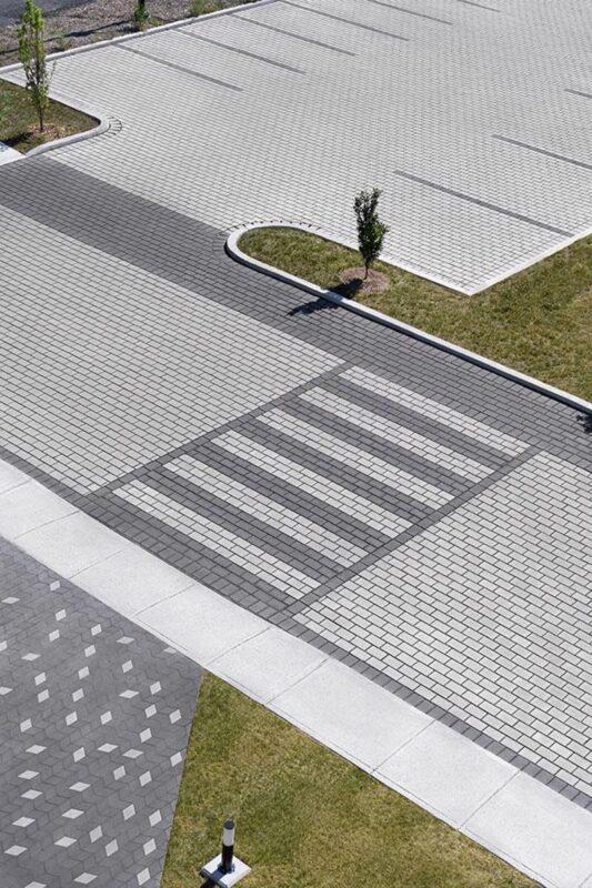A ground-breaking, storm-water management paving system for heavy traffic industrial, commercial and institutional use, Hydra is the ideal solution to address the growing need (and requirement) to increase ground permeability and storm water management. It meets sustainability goals (LEED projects), reduces municipal sewer network overload and provides a cost-effective solution far more durable than conventional asphalt pavements with traditional stormwater drainage solutions. The pavers are 100 mm (3 15/16 in.) thick with an aspect ratio (length divided by thickness) of 3 resulting in a very strong and sustainable permeable pavement. In addition, a mechanical clamp, can be supplied by Techo-Bloc to increase the efficiency of installation to an average of 6000 Square feet per day per clamp – compared to the average installation of 1000 Square feet per day with a crew of 5 laborers. Hydra is part of the dry cast collection.