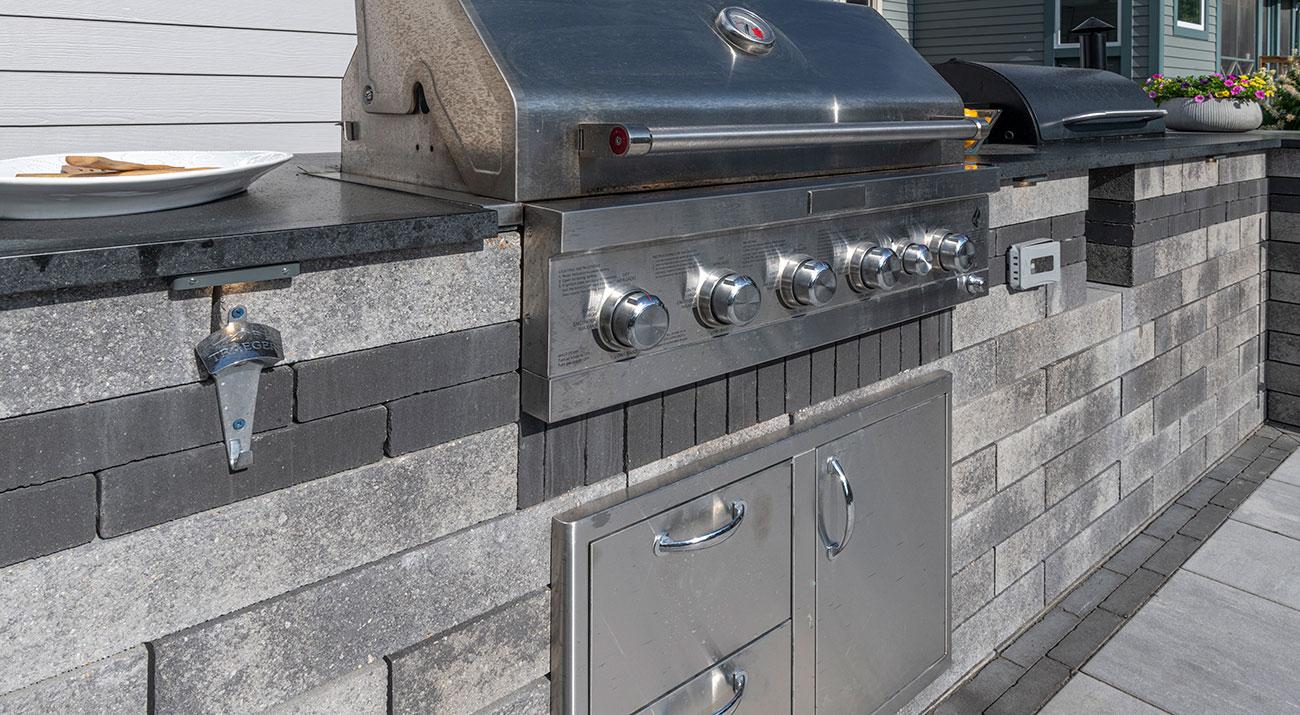 The simple design of Lineo Dimensional Stone makes it a popular choice for contemporary walls, pillars, fire features, grill islands and other vertical features. Sold in a 4-stone random bundle, with the largest unit 24” (61cm) in length, all the sizes contribute to the long, linear look. Spacer strips, sold with the random bundle, ensure even separation between each unit and create shadows that help define each stone. Ledgestone™ or Unilock Natural Stone are both excellent choices to complete the look with coping and pillar caps.