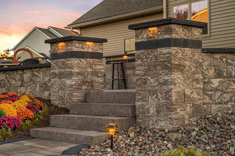 Build freestanding and retaining walls as well as steps, columns and more. Caps are also available. Corners are made by splitting existing units. A special pre-made Corner Wall Stone is now available with no spiting required.