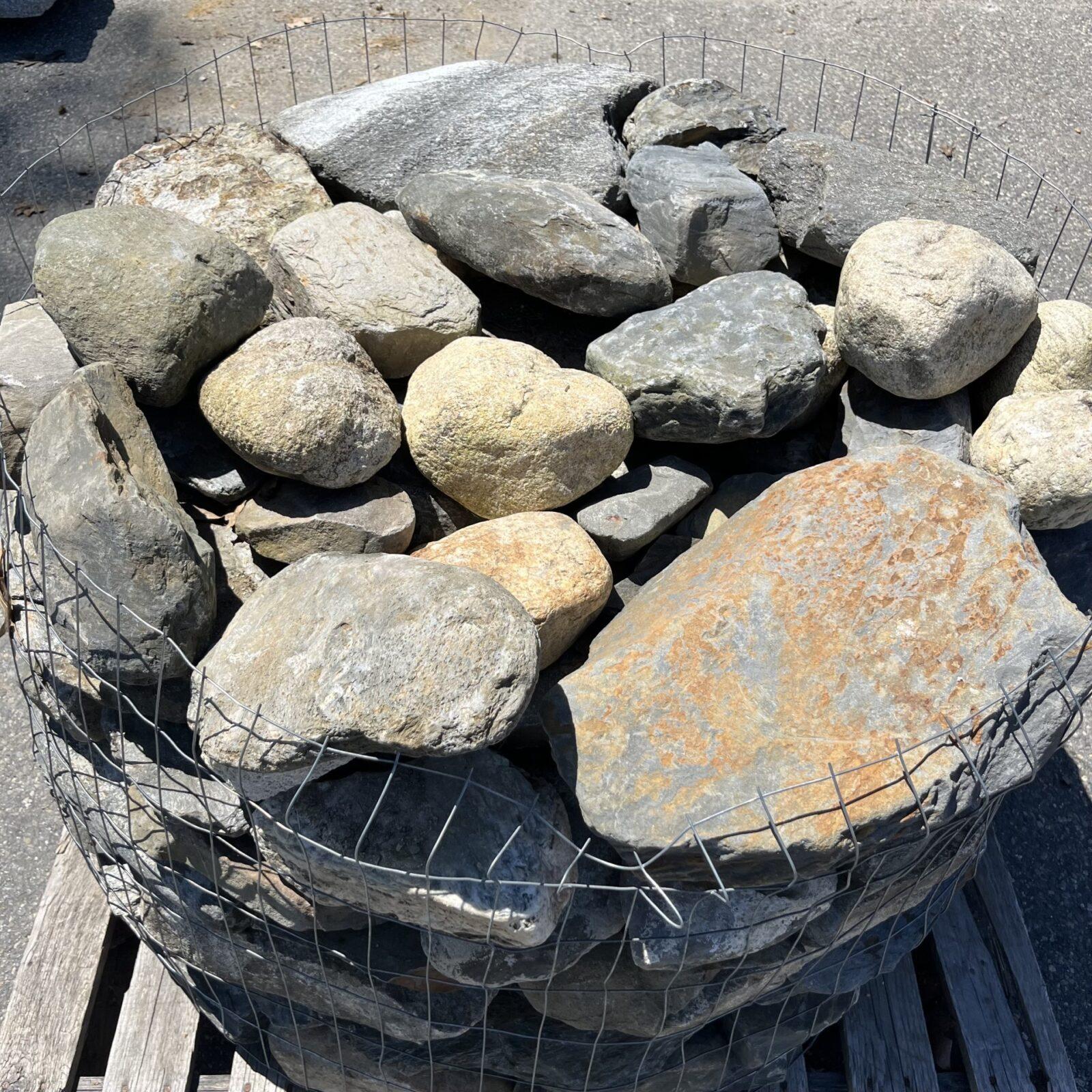 New England Round Stone stands out as a quintessential natural stone, boasting a diverse array of colors that harmonize seamlessly with any New England landscape. Typically ranging from 4 to 16 inches in diameter, the palletized stones weigh around 2800 lbs on average. However, bulk deliveries or custom pallets can accommodate much larger stones. These round fieldstones are frequently employed in retaining walls or water gardens, offering an ideal combination of shapes and textures for a rustic, weathered look. Larger stones serve as striking accents within mulch beds, adding character and charm to outdoor spaces.