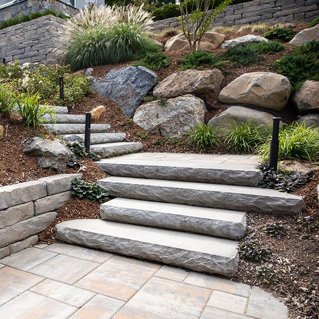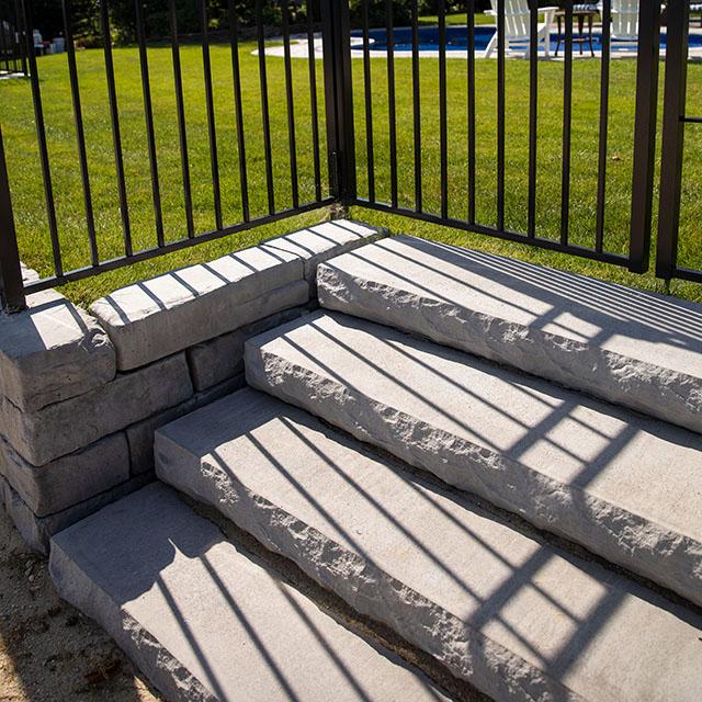 Your landscape and hardscape transitions will be anything but rocky when you’re using the Rockface Steps from Nicolock Paving Stones. The front three sides of these stone steps have chiseled edges to give the appearance of natural weathering and erosion. Nicolock’s state-of-the-art manufacturing process produces consistent and durable steps. A thermal finish makes for a smooth, level surface that’s comfortable to stand on.