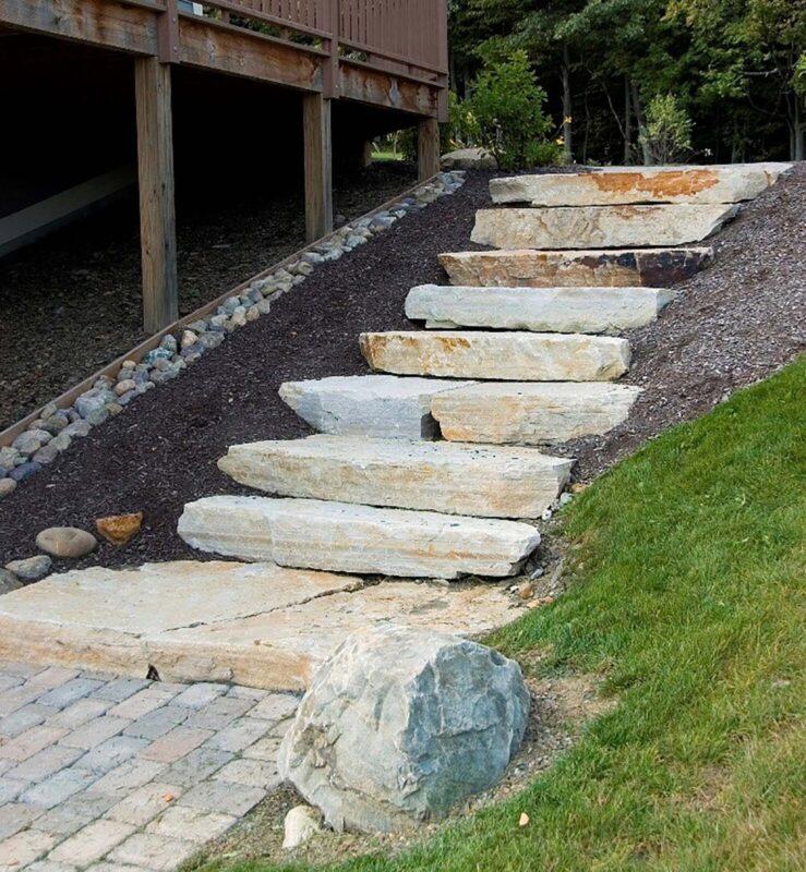 Irregularly shaped quarry material exhibiting the seam (natural) face of the stone.