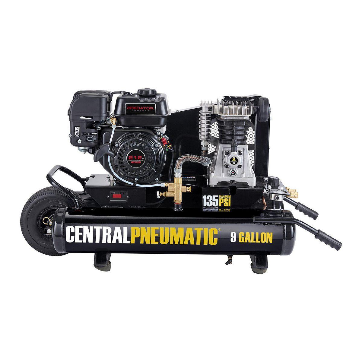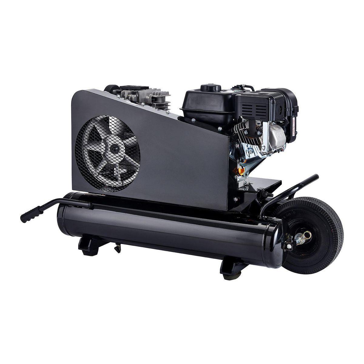 This powerful gas powered 135 PSI air compressor features a wheelbarrow design for easy transport to and from the job site. Twin tanks deliver more consistent line pressure and reduce the amount of moisture in the line. This air compressor also includes an enclosed belt guard that cools the pump and allows for better performance and a longer service life.