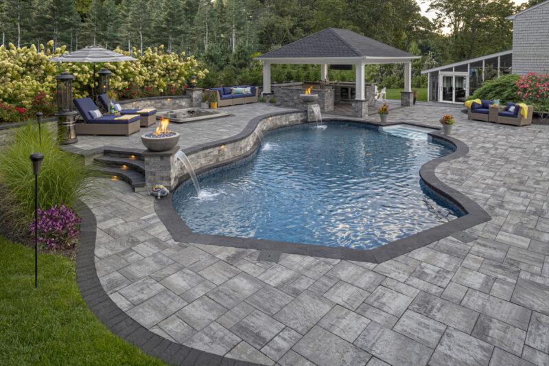 This extraordinary outdoor hardscape, featuring Cambridge Pavers’ Ledgestone XL 3-Pc. Design Kit in Limestone Quarry Blend, seamlessly blends aesthetics with practicality. It’s a space where beauty meets functionality, creating a haven for lasting memories under the open sky.